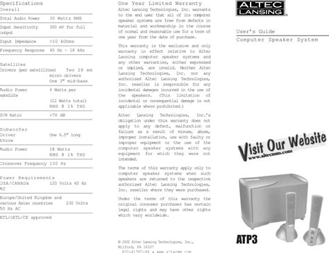 Altec Lansing Atp3 Speaker User Manual. User manual altec lansing t515 82 reviews for the altec. Specifications one year limited warranty overall altec lansing technologies, inc.